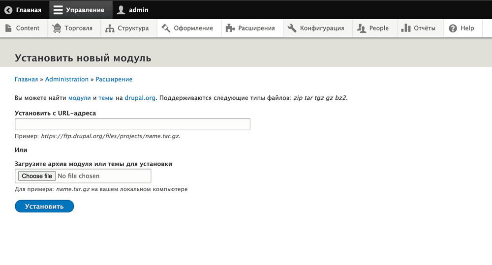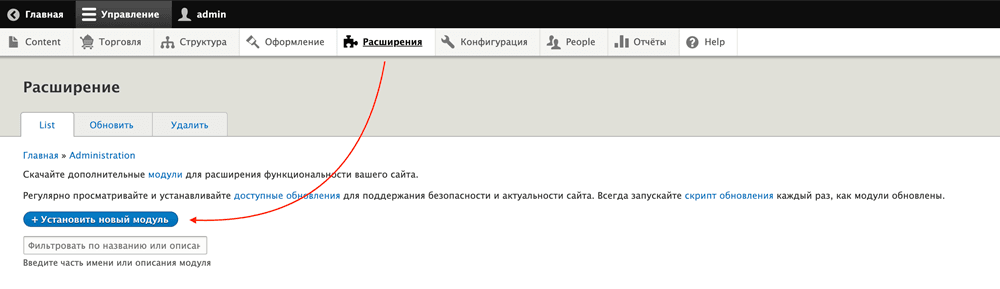 - В верхнем меню выберите Управление > Расширения и нажмите Установить новый модуль.