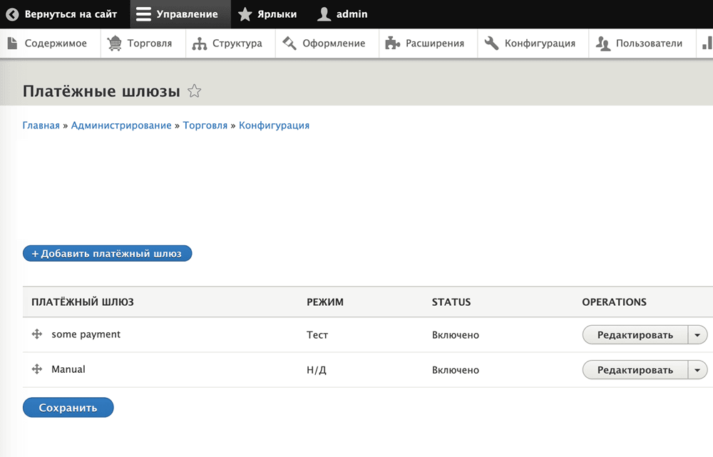 - В верхнем меню выберите Управление > Торговля > Конфигурация > Оплата > Платежные шлюзы.