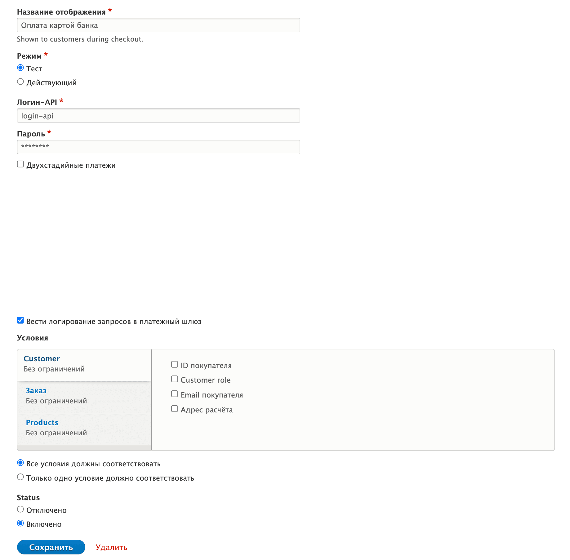 | Условия | Блок настроек, добавленный Drupal Commerce. В настройках указаны правила и логика Drupal для отображения указанного способа получения средств. |