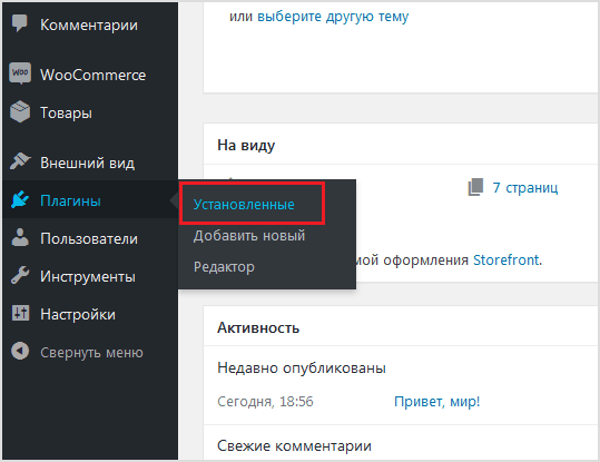 - По завершении установки, на левой панели выберите Плагины > Установленные (см. рисунок ниже).