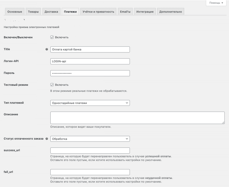 | Тестовый режим | Определяет, работает ли плагин в тестовом режиме или в рабочем режиме. Обратите внимание, что логин и пароль для тестового и рабочего режимов могут отличаться. |