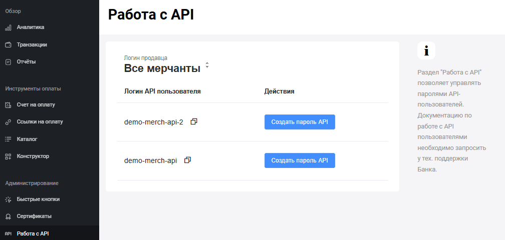 Создание пароля API. Для этого нажмите Создать пароль API.
