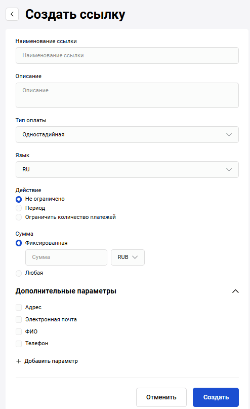 Если выбран тип асимметричной подписи, кнопка Сгенерировать будет неактивна. Ключ для асимметричной подписи можно получить в службе поддержки.