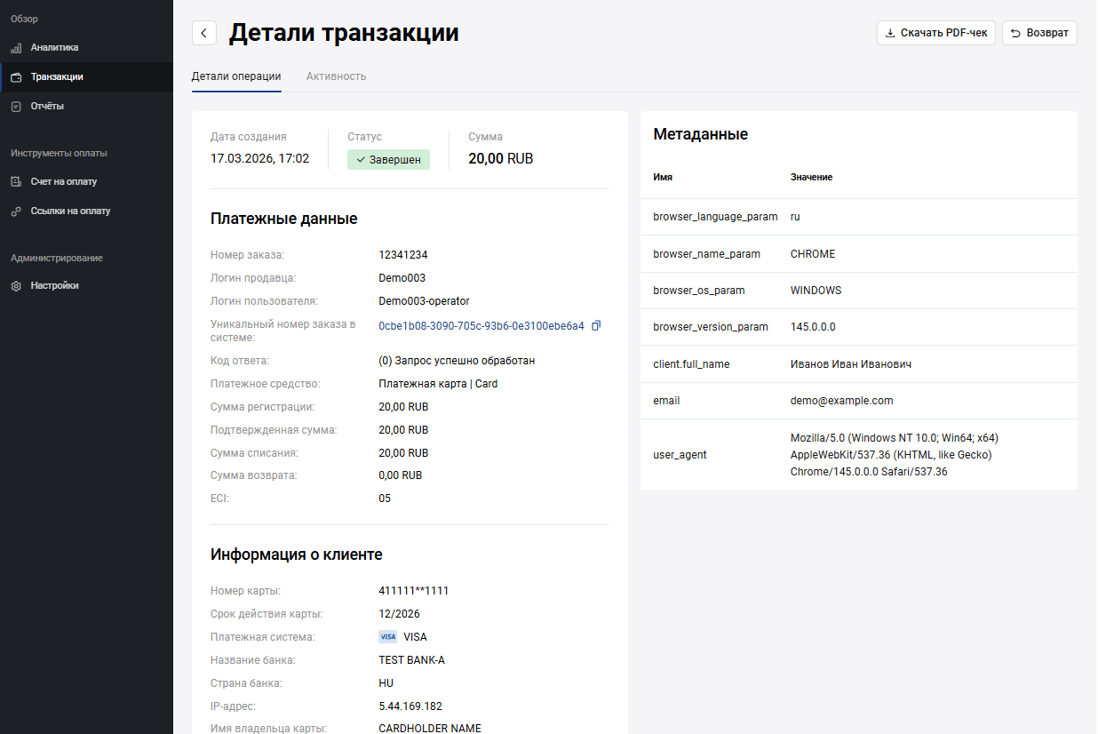 Чтобы отменить платеж, на странице информации о транзакции нажмите кнопку Возврат.