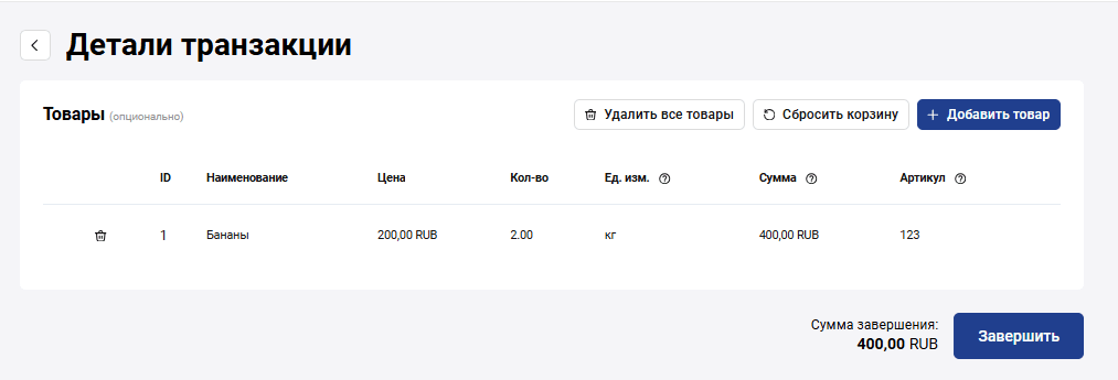 Секция Товары содержит информацию о том, какие товары или услуги оплачены в рамках транзакции.