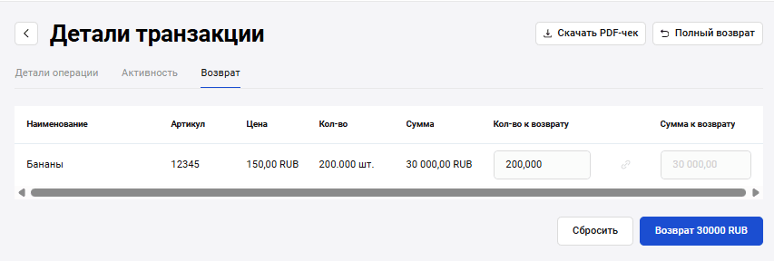 | Сумма к возврату | Сумма возврата, если производился возврат. |