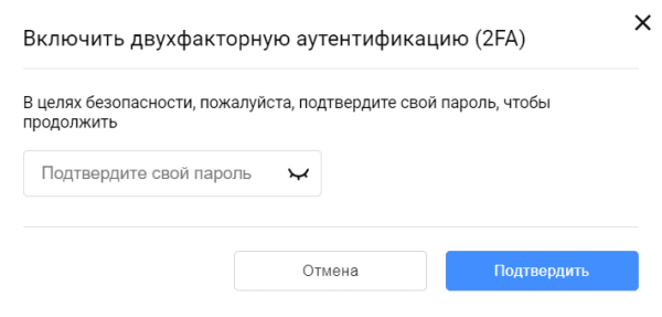 Вы можете настроить двухфакторную аутентификацию, чтобы обеспечить дополнительный уровень безопасности, гарантирующий, что только вы сможете иметь доступ к вашему Личному кабинету. В этом случае при входе в Личный кабинет необходимо ввести не только логин и пароль, но и код аутентификации, сгенерированный приложением Google Authenticator, либо отправленный на вашу электронную почту (в зависимости от включенного способа аутентификации).