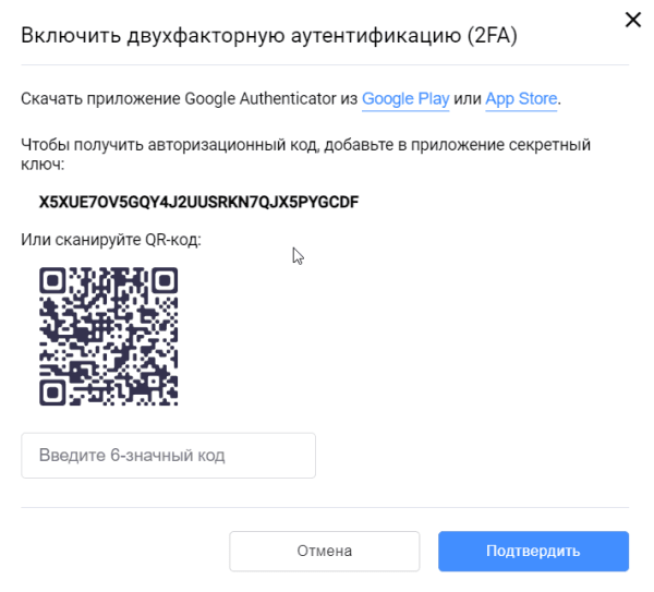 - После того, как вы настроите двухфакторную аутентификацию через Google Authenticator, при следующих входах в ваш Личный кабинет будет запрашиваться код Google Authenticator: